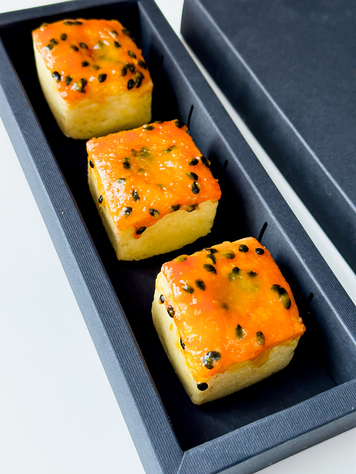 11. Кубик манго-маракуйя (влажный ванильный кекс с центром из конфи манго-маракуйя)