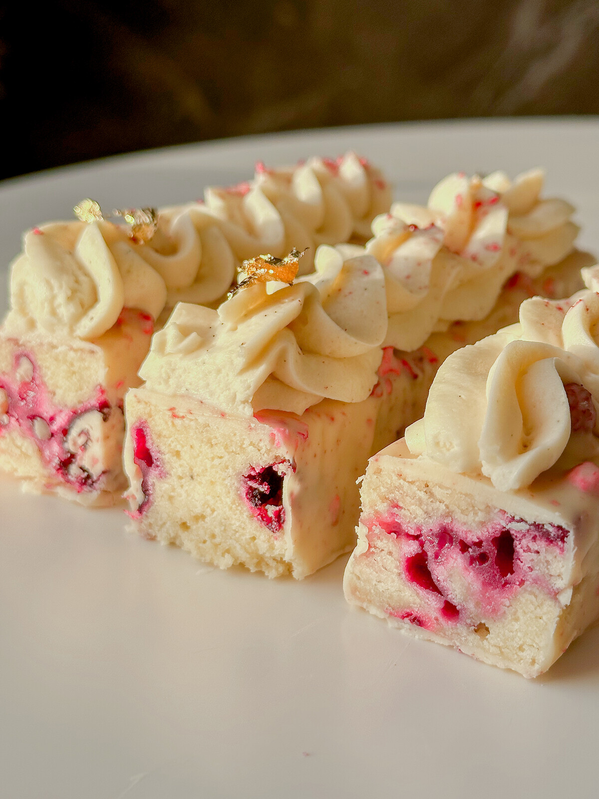 15. Смородиновый мини-кекс (нежный кекс, ванильный ганаш с бобами тонка и глазурью, с сублимированными ягодами)