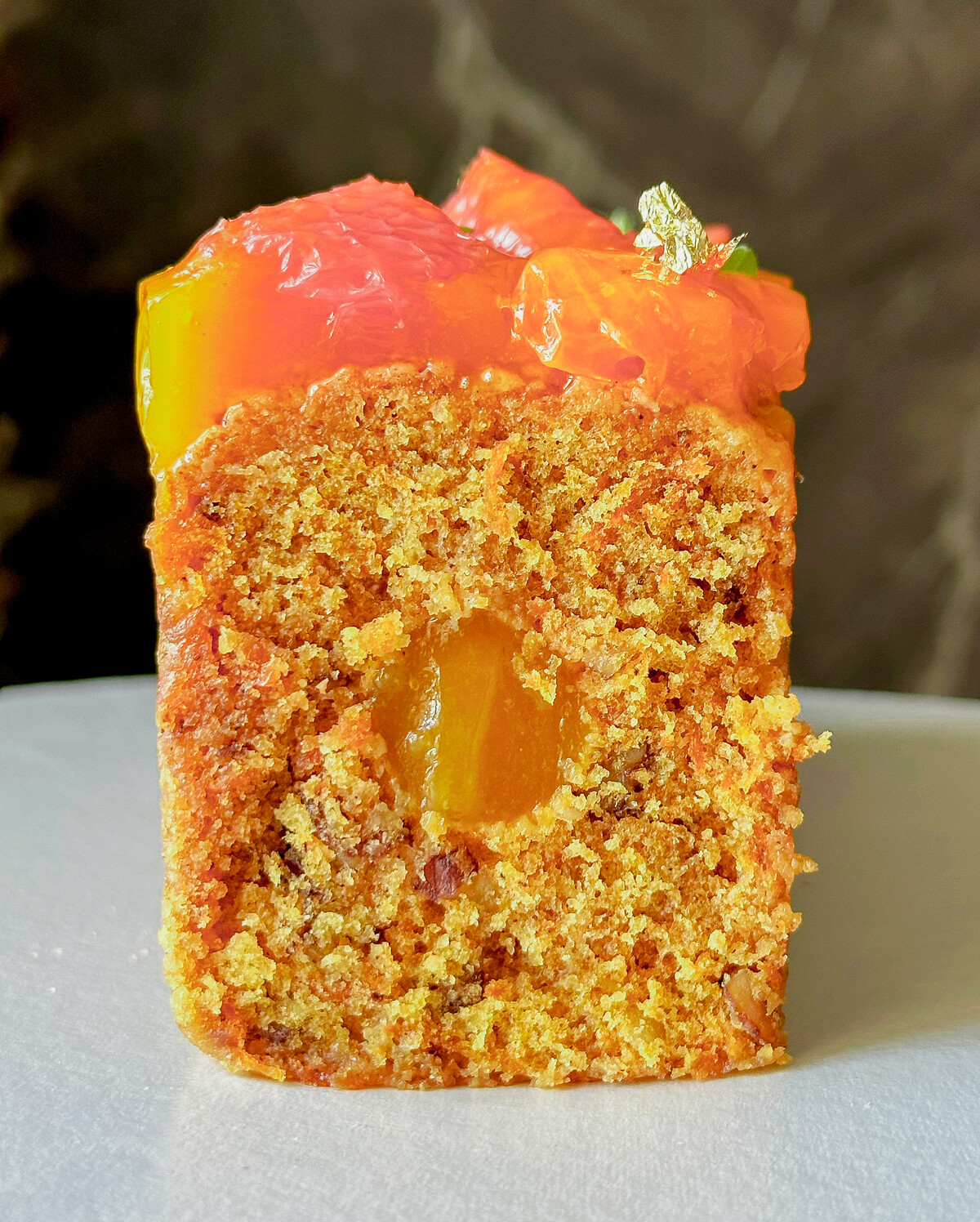 8. Морковь-абрикос (морковный кекс с вяленой вишней и грецкими орехами, с абрикосово-мандариновым конфи и дольками грейпфрута)