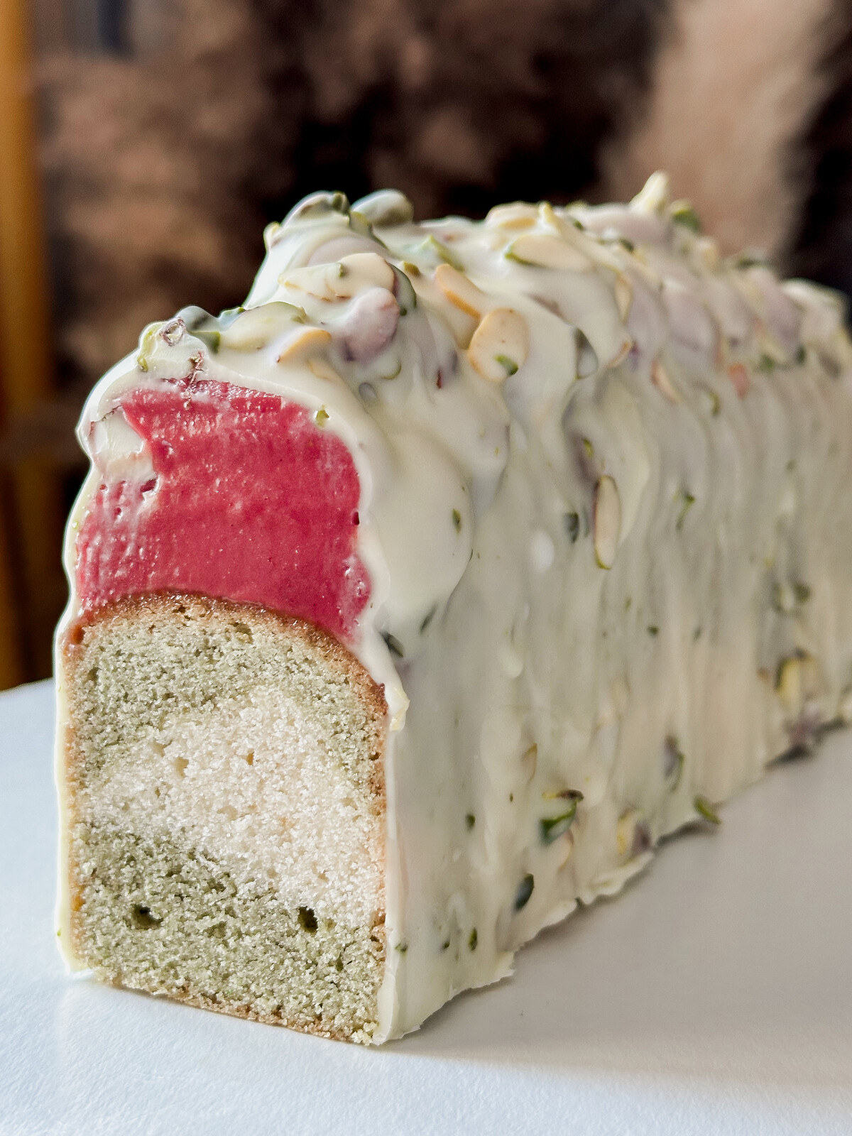3. Фисташковый с вишней (сливочно-фисташковое тесто, вишневый ганаш, глазурь на белом шоколаде с фисташкой)